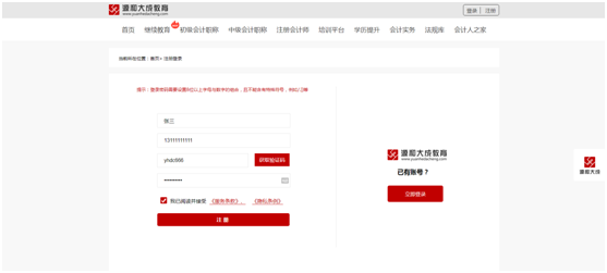 2、进入您所需板块的首页,在右上角点击“登录 | 注册”按钮,输入姓名、手机号,点击获取手机验证码。获取后输入验证码,然后输入登录密码,勾选“阅读并接受《源和大成注册用户服务条款》”, 点击注册按钮,如图3、4所示: